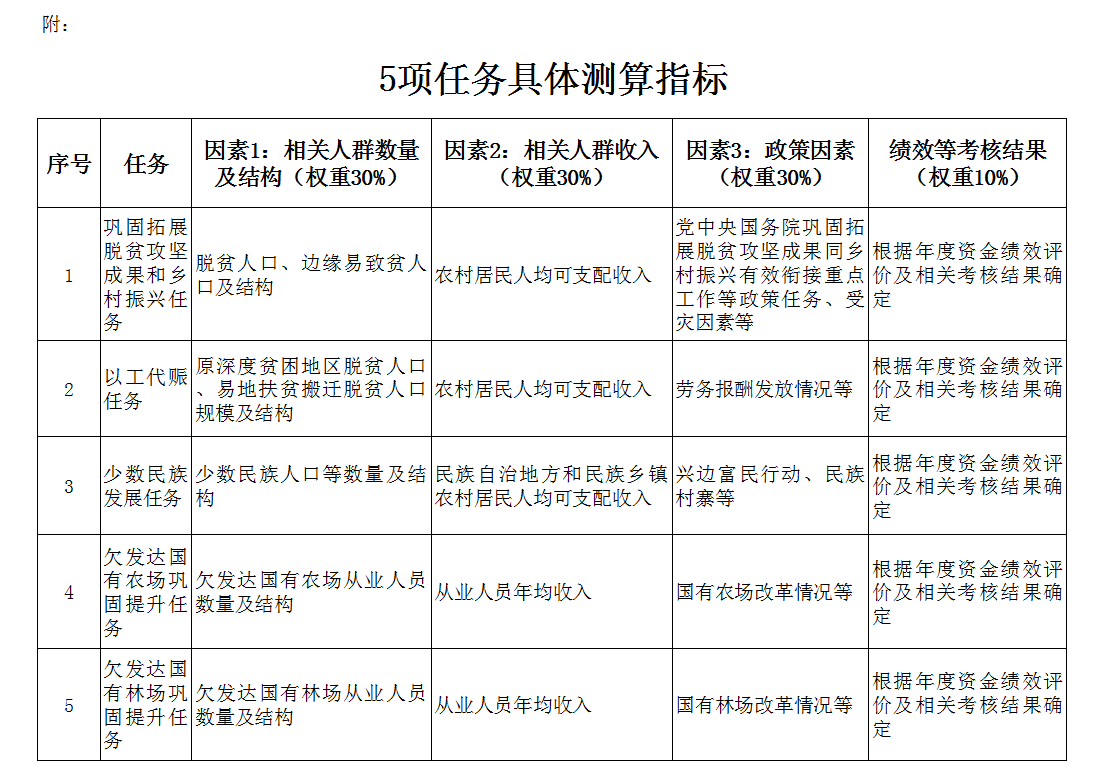 第二條 銜接資金按照鞏固拓展脫貧攻堅(jiān)成果和鄉(xiāng)村振興、以工代賑、少數(shù)民族發(fā)展、欠發(fā)達(dá)國有農(nóng)場(chǎng)鞏固提升、欠發(fā)達(dá)國有林場(chǎng)鞏固提升、“三西”農(nóng)業(yè)建設(shè)任務(wù)進(jìn)行分配。資金分配按照因素法進(jìn)行測(cè)算,因素和權(quán)重為:相關(guān)人群數(shù)量及結(jié)構(gòu)30%、相關(guān)人群收入30%、政策因素30%、績效等考核結(jié)果10%,并進(jìn)行綜合平衡。各項(xiàng)任務(wù)按照上述因素分別確定具體測(cè)算指標(biāo)(詳見附件)?!叭鳌鞭r(nóng)業(yè)建設(shè)任務(wù)按照國務(wù)院批準(zhǔn)的規(guī)模安排。