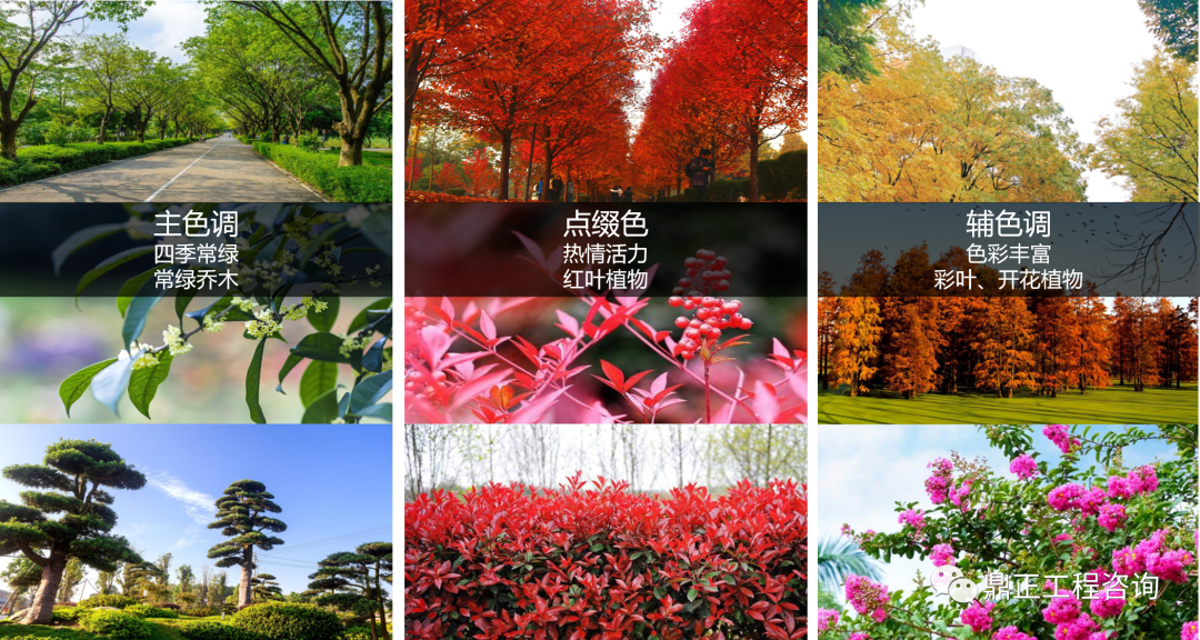 在“生態(tài)園區(qū)”的理念下,以常綠色系為背景色,并以有色系植物來進行層次的豐富,形成色彩繽紛靚麗,四季有花的景觀風(fēng)貌。