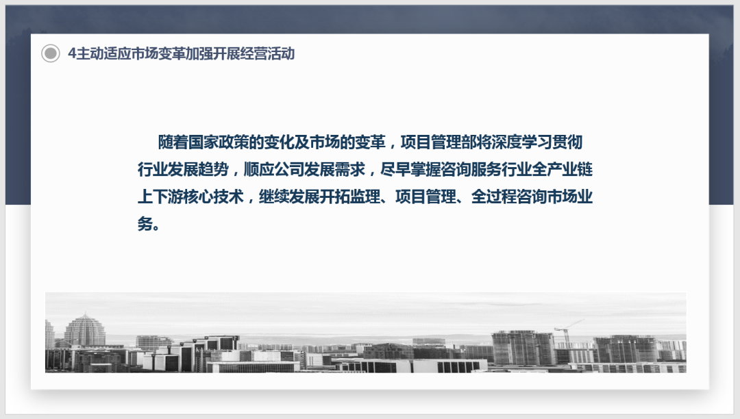 2、項(xiàng)目管理事業(yè)部:及時(shí)總結(jié)已完及在建全過(guò)程工程咨詢項(xiàng)目管理經(jīng)驗(yàn),緊跟公司發(fā)展戰(zhàn)略定位,不斷提高工程咨詢?nèi)a(chǎn)業(yè)鏈上下游核心技術(shù)水平,積極發(fā)展開拓工程監(jiān)理、項(xiàng)目管理、全過(guò)程工程咨詢業(yè)務(wù)。