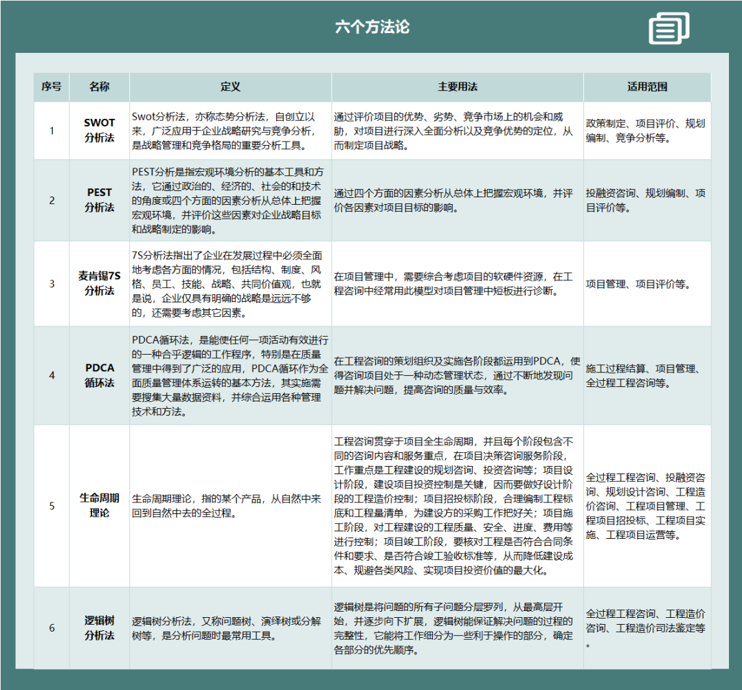 在理念更新迭代以后,行動必須緊緊跟上。王志綱老師曾說:“我手中掌握的超級法寶,就是方法論。只有掌握了正確的方法論,才能做到海納百川,消化一切?!?因此,作為一家工程咨詢服務機構,工作方法論便是幫助我們更好地診斷、研判、分析、實操項目的獨門秘方。