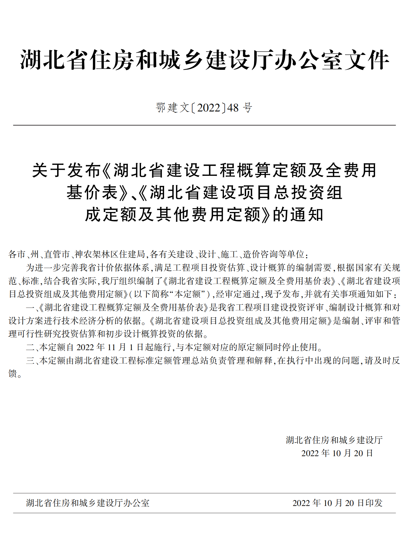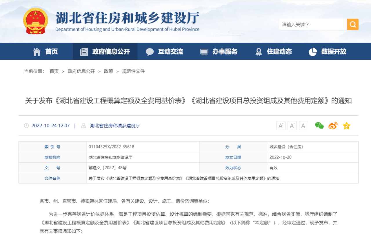 湖北省住建廳發(fā)布《湖北省建設(shè)工程概算定額及全費(fèi)用基價表》《湖北省建設(shè)項(xiàng)目總投資組成及其他費(fèi)用定額》的通知