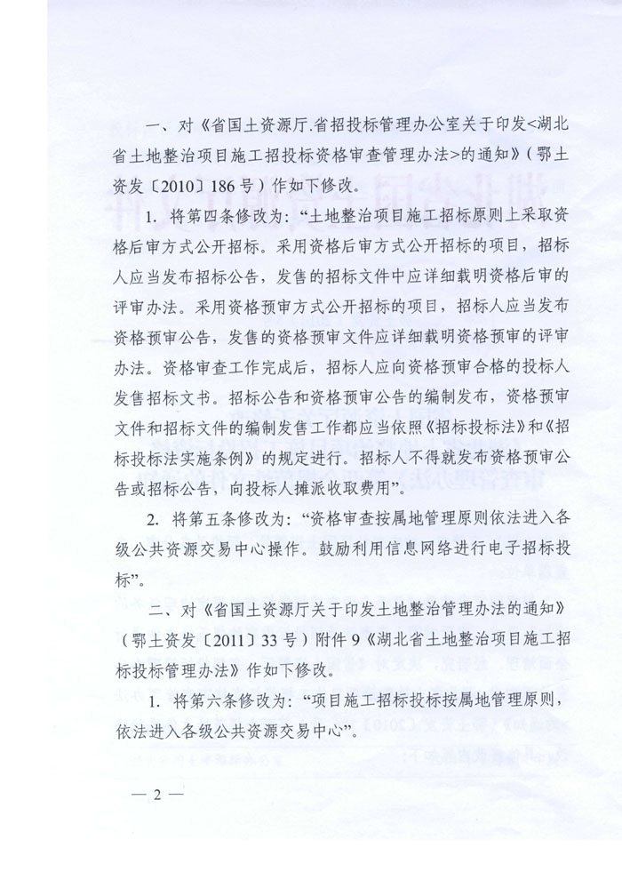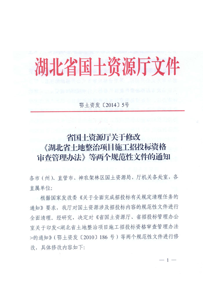 湖北省國土資源廳關(guān)于修改《湖北省土地整治項目施工招投標(biāo)資格審查辦法》等兩個規(guī)范性文件的通知