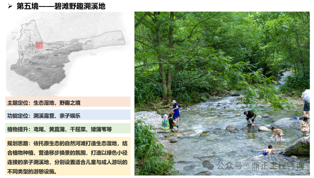 一水為引,指出治理對(duì)象,即羊樓洞港小流域;兩岸交映,指出治理范圍,即包括上下游、左右岸、堤內(nèi)外;三生融合,指出治理路徑,即走好生產(chǎn)、生活、生態(tài)協(xié)調(diào)發(fā)展之路;五境共生,即為五個(gè)治理分區(qū),通過(guò)分段體現(xiàn)差異化分區(qū)的理念,以線帶面也利于實(shí)施過(guò)程中分期分段逐步推進(jìn)。每個(gè)分區(qū)都有具體的功能定位、治理目標(biāo)、治理標(biāo)準(zhǔn),因此不同分區(qū)名稱(chēng)就是該區(qū)治理特色的高度凝練,既要體現(xiàn)水系的區(qū)位,如“茗士泉源”對(duì)應(yīng)相公泉,“茶馬古鎮(zhèn)”對(duì)應(yīng)羊樓洞古鎮(zhèn),“松峰”對(duì)應(yīng)松峰山;也要體現(xiàn)水系的形態(tài),如“泉”、“溪”、“疊水”等;還要體現(xiàn)水系的功能,如“稻香”對(duì)應(yīng)田園塘渠,“水鄉(xiāng)”對(duì)應(yīng)生活河道,“碧灘”對(duì)應(yīng)生態(tài)濕地等。
