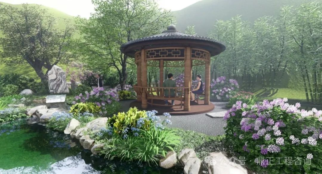 水景觀水文化打造:通過(guò)深挖相公泉?dú)v史文化內(nèi)涵,進(jìn)行本地印象提煉。“相公”一詞在古代,是妻子對(duì)丈夫的稱(chēng)呼,也是君子、生員(秀才、相公)、宰相的另一種叫法。君子愛(ài)茶,沏茶品茗,修煉品性,以茶可雅志,茶是象征著塵世的純潔。設(shè)計(jì)從自然山水出發(fā),落位于閑情逸致設(shè)計(jì)基調(diào),泉眼處采用題字景石配上一棵姿態(tài)旖旎的紅豆,視線端頭一幅竹影錦鯉、花木跌水的畫(huà)面映入眼簾,兩側(cè)的樹(shù)木林立,開(kāi)合有致,整個(gè)節(jié)點(diǎn)的中心是一座圓頂茶亭,在亭中,一壺清茶問(wèn)道,仿佛拉近了古今往事,也增加了場(chǎng)地的記憶,呈現(xiàn)出 “千年古樹(shù)頻招手,萬(wàn)年清泉溢清香”的意境。