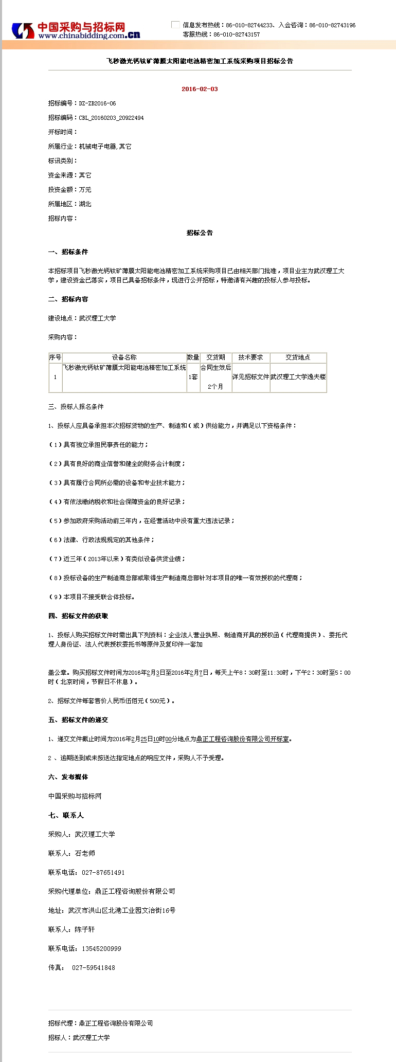 飛秒激光鈣鈦礦薄膜太陽能電池精密加工系統(tǒng)采購項目招標公告