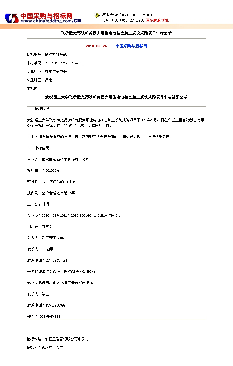 飛秒激光鈣鈦礦薄膜太陽能電池精密加工系統(tǒng)采購(gòu)項(xiàng)目中標(biāo)公示