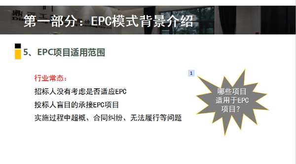 下午,采購與招標代理事業(yè)部的潘勝強帶來了《EPC項目招標實務》的主題培訓。潘勝強首先介紹了EPC模式的背景,包含工程總承包的主要模式,EPC發(fā)展狀況,EPC項目適用范圍,招標流程等多方面內(nèi)容。隨后對EPC項目招標要點進行了解析,結合相關政策文件對工程總承包發(fā)包階段和條件、資格條件的設置、EPC項目前期單位是否可以參與后期投標、合同計價方式、分包原則進行了詳細的解讀。
