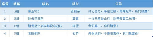 公司總部全員及分公司部分代表,共分為4個隊伍參賽。為保證全員參與且不受題目限制,全體員工跨部門分組,每組成員均由業(yè)務(wù)部門及非業(yè)務(wù)部門人員組成,最終分為A、B、C、D四組。