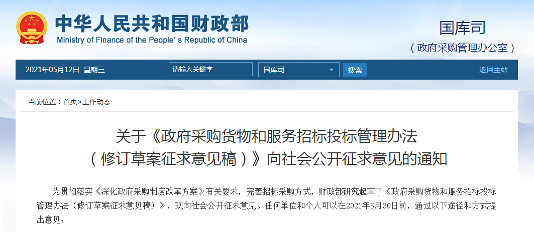 為貫徹落實《深化政府采購制度改革方案》有關(guān)要求,完善招標(biāo)采購方式,財政部研究起草了《政府采購貨物和服務(wù)招標(biāo)投標(biāo)管理辦法(修訂草案征求意見稿)》,現(xiàn)向社會公開征求意見。任何單位和個人可以在2021年5月30日前,通過以下途徑和方式提出意見: