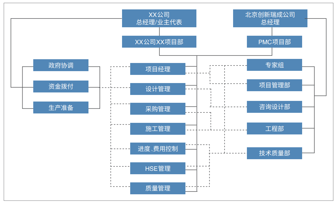 實(shí)踐中,運(yùn)用矩陣式管理結(jié)構(gòu)的原理,具體設(shè)計(jì)業(yè)主項(xiàng)目管理團(tuán)隊(duì)(PMC/IPMT)的組織機(jī)構(gòu)時(shí),還應(yīng)綜合考慮工程項(xiàng)目建設(shè)內(nèi)容、規(guī)模、區(qū)域、建設(shè)周期等因素,進(jìn)行因地制宜設(shè)計(jì)。