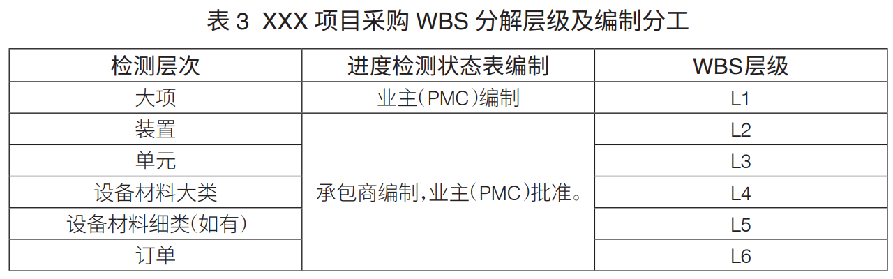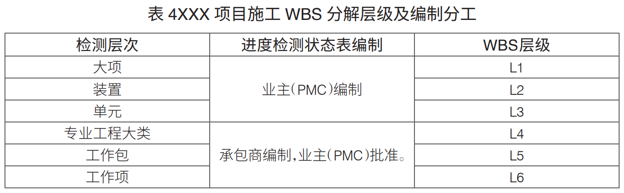 工程項(xiàng)目WBS分解層級(jí):工程項(xiàng)目WBS分解主要是進(jìn)行設(shè)計(jì)、采購(gòu)、施工WBS分解。通常,設(shè)計(jì)WBS分解至七級(jí)、采購(gòu)WBS分解至六級(jí)、施工WBS分解至六級(jí),可滿足工程管理要求(表1)。
