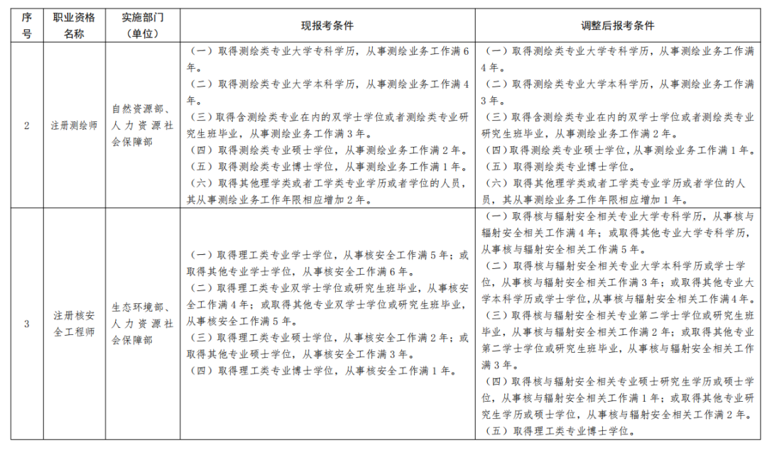 一、《部分準(zhǔn)入類職業(yè)資格考試工作年限要求調(diào)整方案》(見附件)自2022年起實施。除調(diào)整考試工作年限要求外,13項準(zhǔn)入類職業(yè)資格的其他考試報名條件不變。