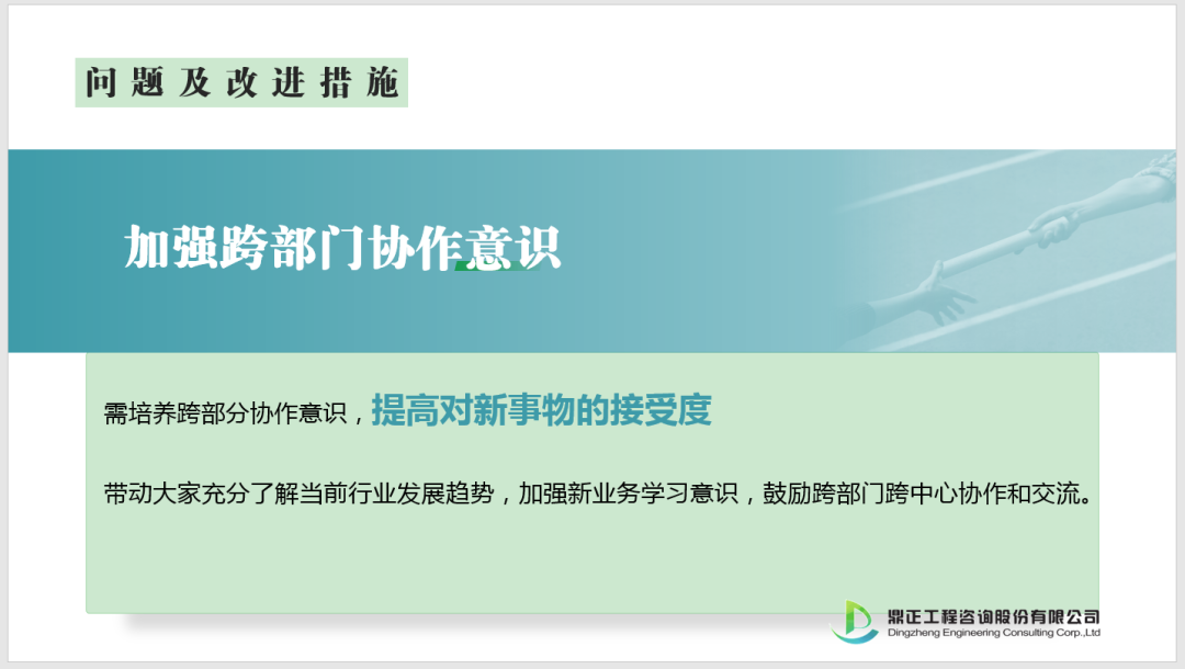 1、工程咨詢事業(yè)部:持續(xù)保持積極向上的態(tài)度,從人才儲(chǔ)備、資質(zhì)資信、技術(shù)沉淀、經(jīng)驗(yàn)積累等方面做了大量工作,為部門“十四五”發(fā)展做了充足的準(zhǔn)備。