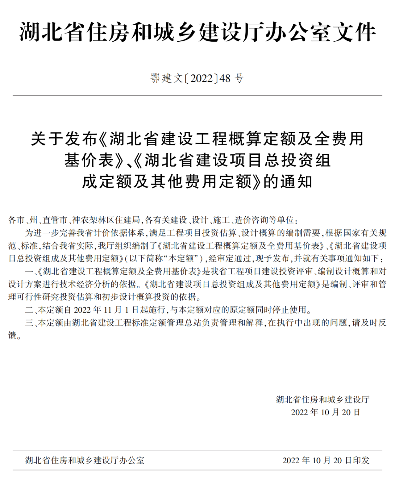 湖北省住建廳發(fā)布《湖北省建設(shè)工程概算定額及全費(fèi)用基價表》《湖北省建設(shè)項(xiàng)目總投資組成及其他費(fèi)用定額》的通知