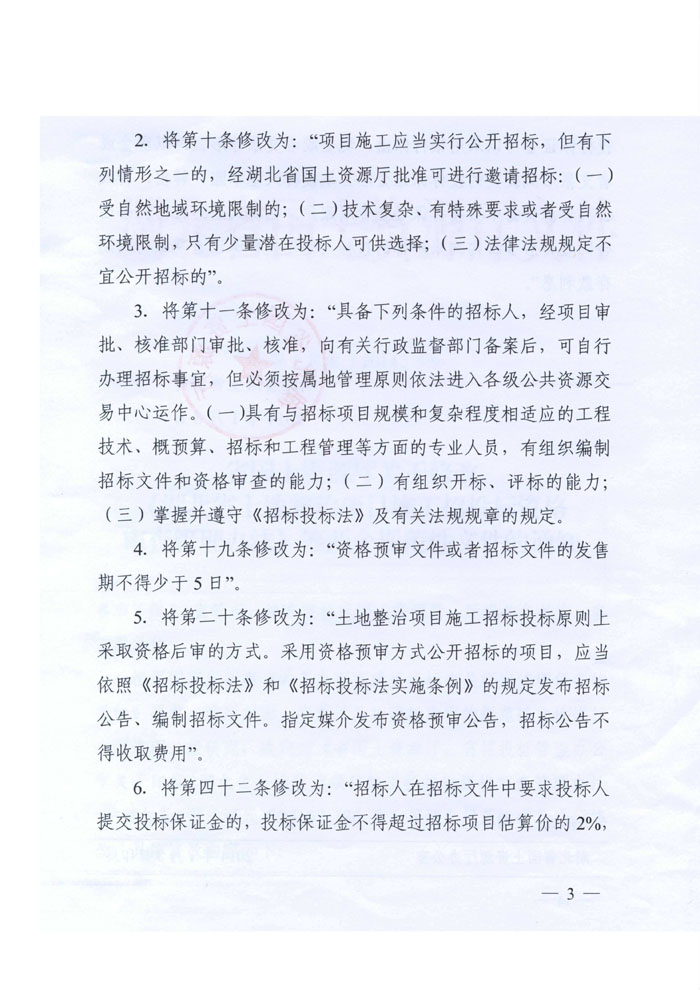 湖北省國土資源廳關(guān)于修改《湖北省土地整治項目施工招投標(biāo)資格審查辦法》等兩個規(guī)范性文件的通知