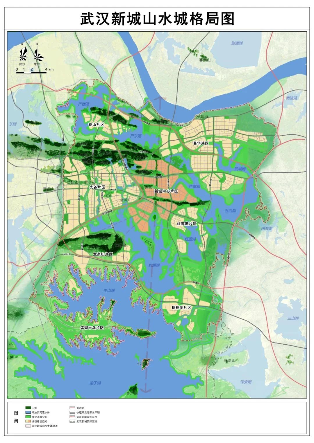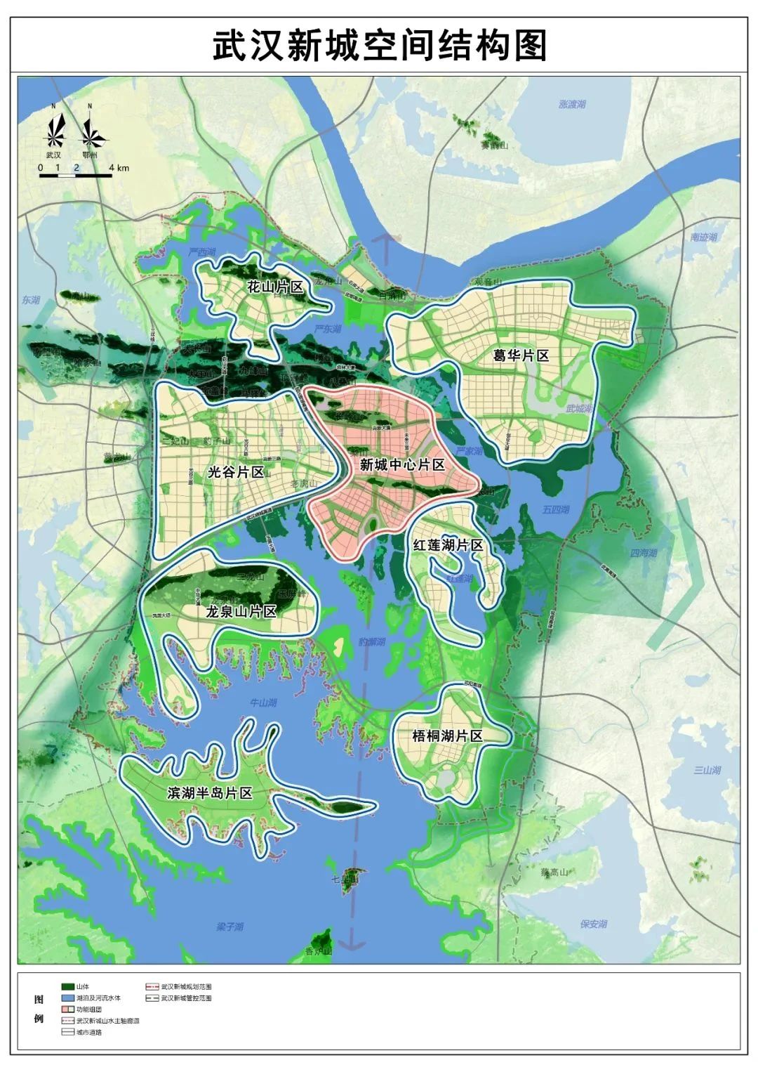 按照“山水城、家園城、智慧城”三大目標(biāo),構(gòu)建山湖相映、組團(tuán)發(fā)展的空間結(jié)構(gòu),劃分新城中心片區(qū)、光谷片區(qū)、葛華片區(qū)、花山片區(qū)、龍泉山片區(qū)、紅蓮湖片區(qū)、梧桐湖片區(qū)、濱湖半島片區(qū)共8大片區(qū),形成產(chǎn)城融合、功能復(fù)合的空間布局。