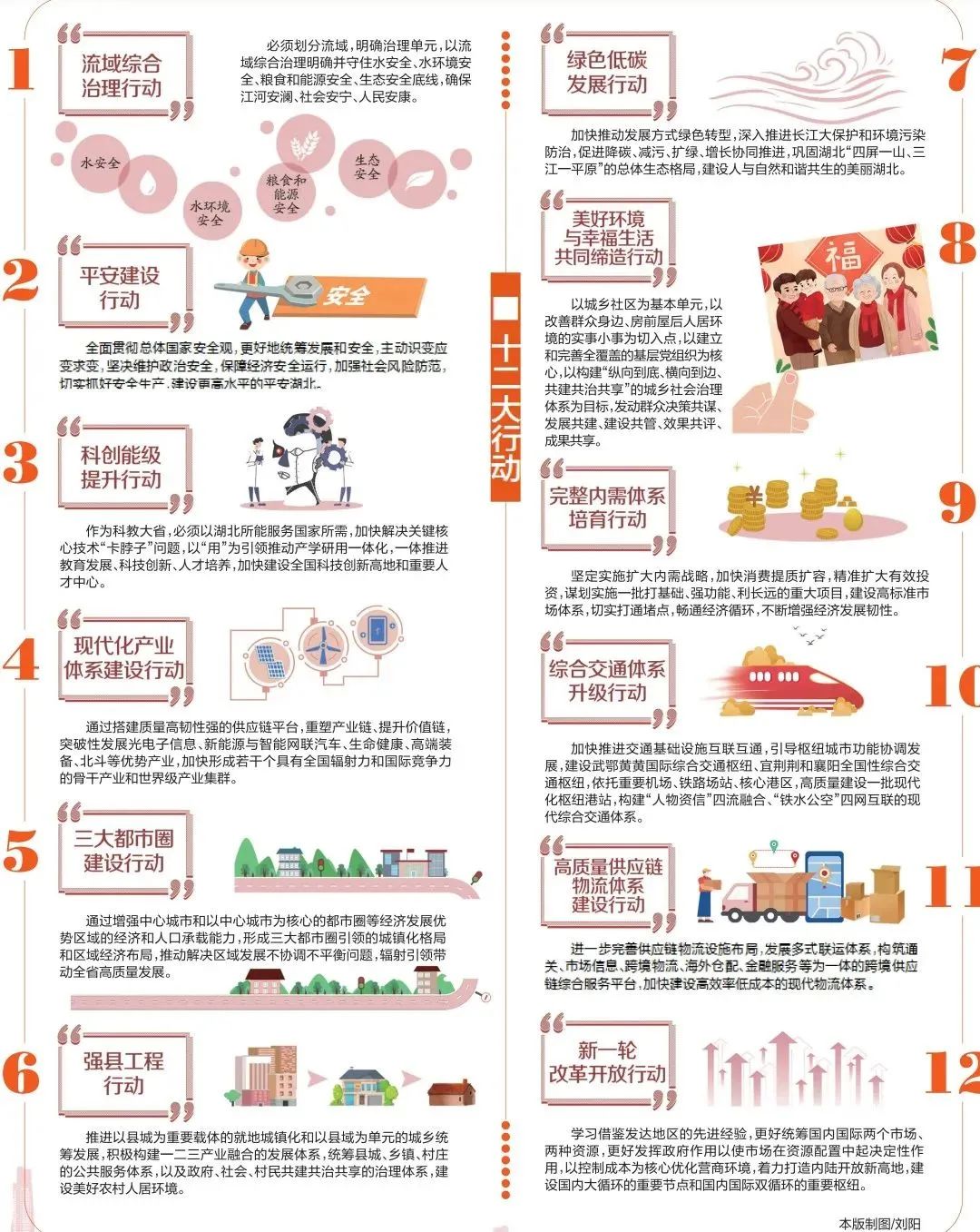 4月18日,湖北省政府新聞辦召開《關(guān)于加快建設(shè)全國構(gòu)建新發(fā)展格局先行區(qū)的實施意見》(以下簡稱《實施意見》)精神解讀系列新聞發(fā)布會第一場?!秾嵤┮庖姟饭卜秩蟛糠趾透郊?。第一部分是總體要求,主要闡述文件起草的指導(dǎo)思想、總體思路、基本原則、主要目標(biāo);第二部分是主體,圍繞統(tǒng)籌發(fā)展和安全、統(tǒng)籌城鄉(xiāng)區(qū)域和資源環(huán)境、統(tǒng)籌國內(nèi)國際兩個市場兩種資源,部署“十二大行動”(具體內(nèi)容見下圖);第三部分從組織領(lǐng)導(dǎo)、完善配套政策、加強考核評估等方面強調(diào)了推進實施的保障措施。附件為加快建設(shè)全國構(gòu)建新發(fā)展格局先行區(qū)的主要指標(biāo),設(shè)定了71項數(shù)據(jù)指標(biāo)。