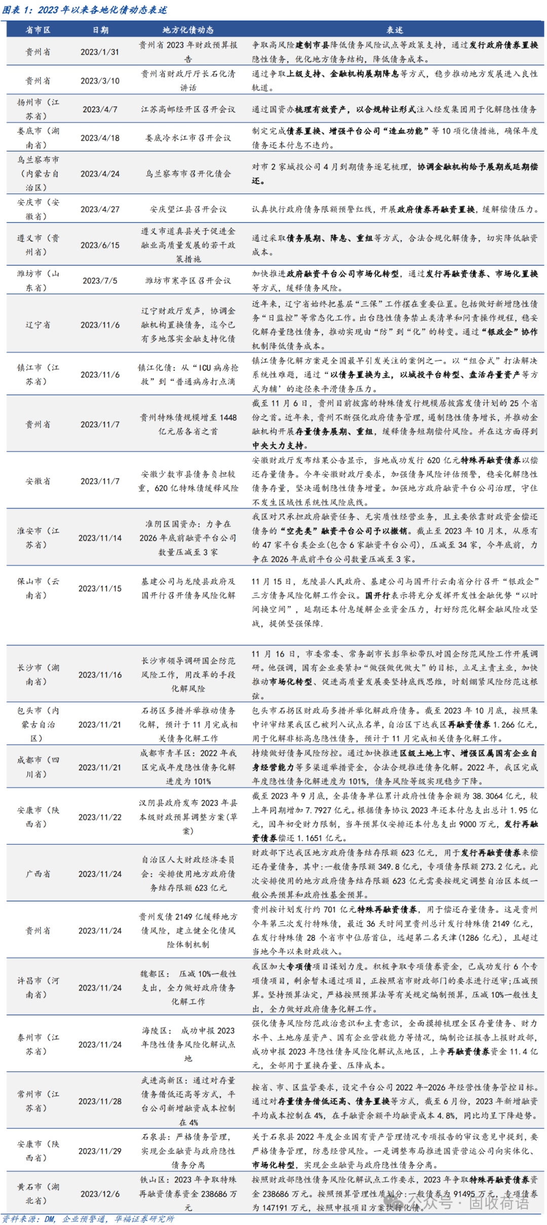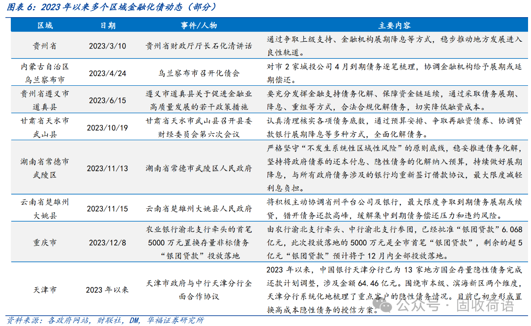財(cái)政部《地方全口徑債務(wù)清查統(tǒng)計(jì)填報(bào)說(shuō)明》中提出六種常見(jiàn)的債務(wù)化解舉措,具體為(1)安排財(cái)政資金償還;(2)出讓政府股權(quán)以及經(jīng)營(yíng)性國(guó)有資產(chǎn)權(quán)益償還;(3)利用項(xiàng)目結(jié)轉(zhuǎn)資金、經(jīng)營(yíng)收入償還;(4)合規(guī)轉(zhuǎn)化為企業(yè)經(jīng)營(yíng)性債務(wù);(5)通過(guò)借新還舊、展期等方式償還;(6)采取破產(chǎn)重整或清算方式化解。同時(shí),根據(jù)各地化債動(dòng)態(tài)表述,各地根據(jù)自身情況,積極探索了金融機(jī)構(gòu)貸款置換、城投平臺(tái)整合或轉(zhuǎn)型、特殊再融資債置換、設(shè)立化債基金等方式推動(dòng)化債進(jìn)程。