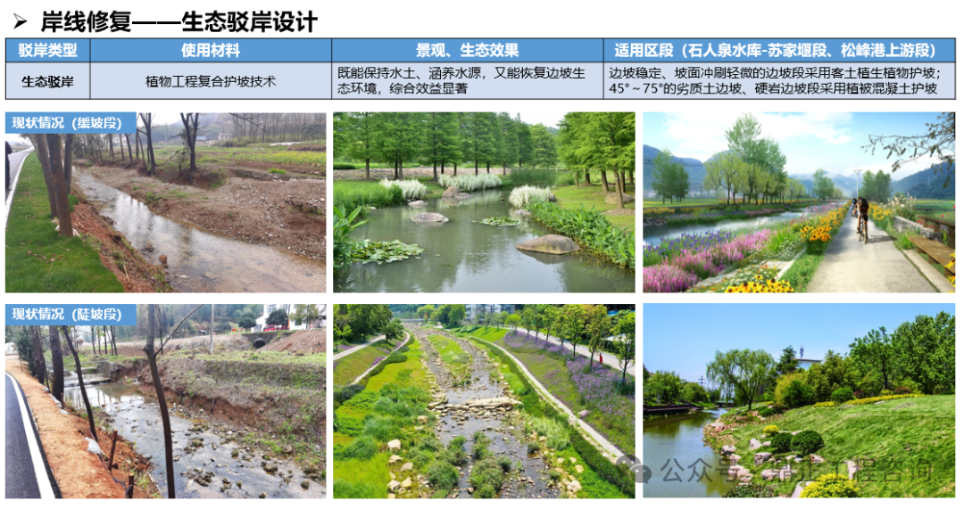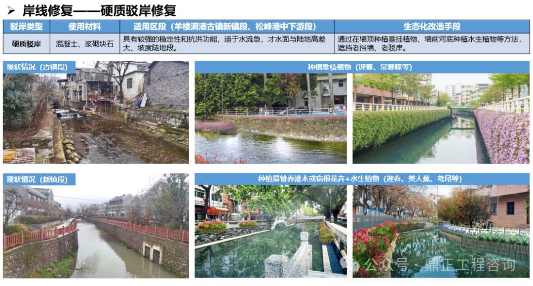 生態(tài)方面,打造“羊樓生態(tài)廊”,以水提質(zhì),修復(fù)流域生態(tài),即實(shí)施一批駁岸整治、水質(zhì)提升、生境構(gòu)建等河道治理措施進(jìn)行水岸共治。針對(duì)水生態(tài)的修復(fù),根據(jù)不同水體類(lèi)型提出技術(shù)方式;對(duì)于岸線的修復(fù),又針對(duì)不同的駁岸類(lèi)型提出適用的整治措施。