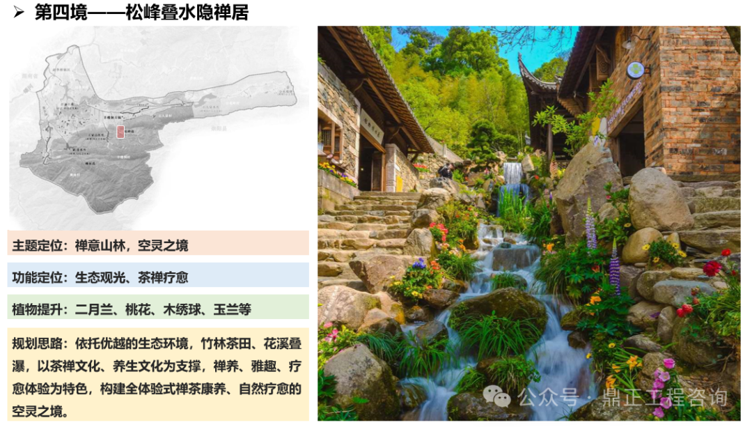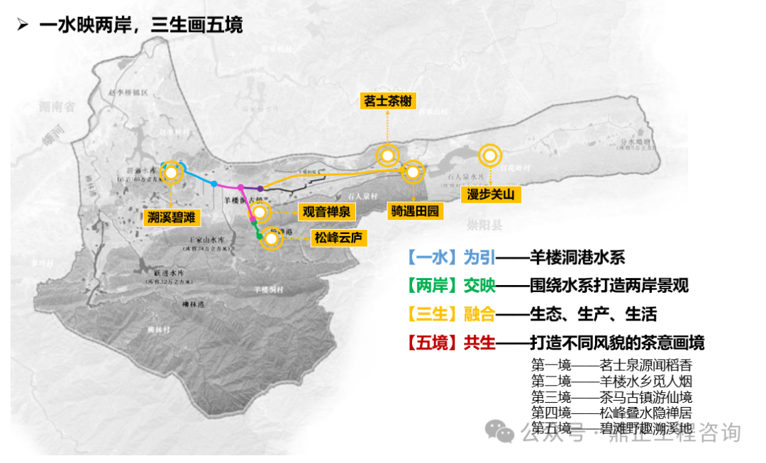 一水為引,指出治理對(duì)象,即羊樓洞港小流域;兩岸交映,指出治理范圍,即包括上下游、左右岸、堤內(nèi)外;三生融合,指出治理路徑,即走好生產(chǎn)、生活、生態(tài)協(xié)調(diào)發(fā)展之路;五境共生,即為五個(gè)治理分區(qū),通過(guò)分段體現(xiàn)差異化分區(qū)的理念,以線帶面也利于實(shí)施過(guò)程中分期分段逐步推進(jìn)。每個(gè)分區(qū)都有具體的功能定位、治理目標(biāo)、治理標(biāo)準(zhǔn),因此不同分區(qū)名稱(chēng)就是該區(qū)治理特色的高度凝練,既要體現(xiàn)水系的區(qū)位,如“茗士泉源”對(duì)應(yīng)相公泉,“茶馬古鎮(zhèn)”對(duì)應(yīng)羊樓洞古鎮(zhèn),“松峰”對(duì)應(yīng)松峰山;也要體現(xiàn)水系的形態(tài),如“泉”、“溪”、“疊水”等;還要體現(xiàn)水系的功能,如“稻香”對(duì)應(yīng)田園塘渠,“水鄉(xiāng)”對(duì)應(yīng)生活河道,“碧灘”對(duì)應(yīng)生態(tài)濕地等。