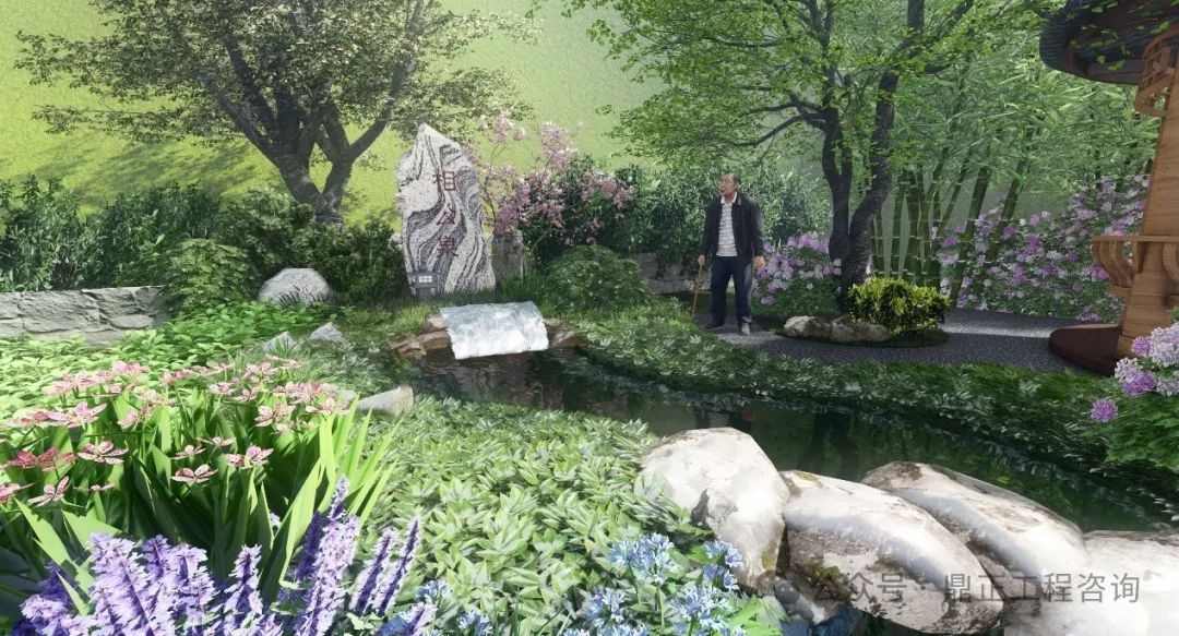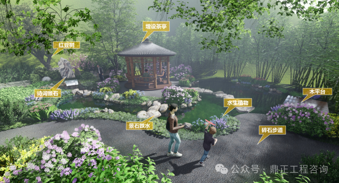 水景觀水文化打造:通過(guò)深挖相公泉?dú)v史文化內(nèi)涵,進(jìn)行本地印象提煉。“相公”一詞在古代,是妻子對(duì)丈夫的稱(chēng)呼,也是君子、生員(秀才、相公)、宰相的另一種叫法。君子愛(ài)茶,沏茶品茗,修煉品性,以茶可雅志,茶是象征著塵世的純潔。設(shè)計(jì)從自然山水出發(fā),落位于閑情逸致設(shè)計(jì)基調(diào),泉眼處采用題字景石配上一棵姿態(tài)旖旎的紅豆,視線端頭一幅竹影錦鯉、花木跌水的畫(huà)面映入眼簾,兩側(cè)的樹(shù)木林立,開(kāi)合有致,整個(gè)節(jié)點(diǎn)的中心是一座圓頂茶亭,在亭中,一壺清茶問(wèn)道,仿佛拉近了古今往事,也增加了場(chǎng)地的記憶,呈現(xiàn)出 “千年古樹(shù)頻招手,萬(wàn)年清泉溢清香”的意境。