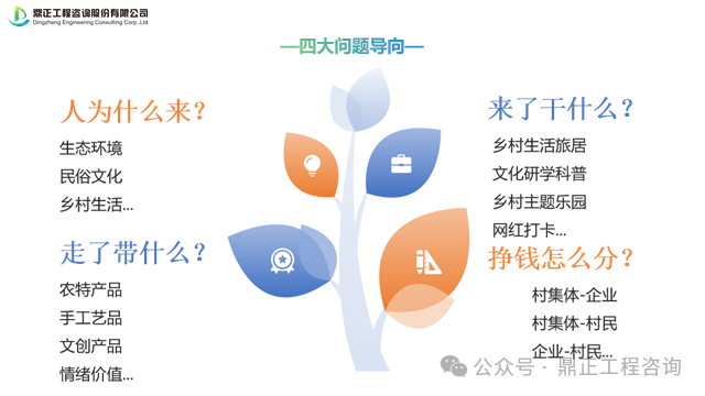 圍繞人為什么來、來了干什么、走了帶什么、掙錢怎么分四大問題去思考鄉(xiāng)村該怎么運營,去明確鄉(xiāng)村的主題定位、發(fā)展方向、核心產(chǎn)品、運營方式,更好地推進(jìn)鄉(xiāng)村運營。