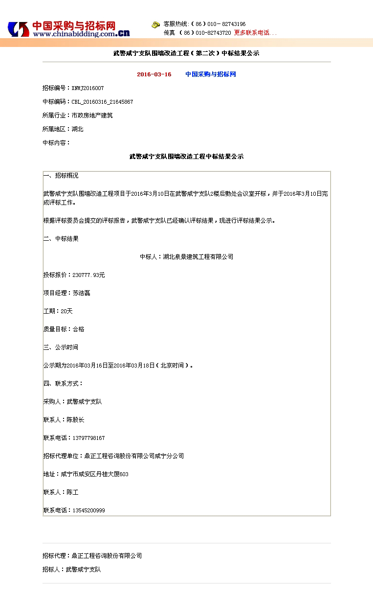 武警咸寧支隊(duì)圍墻改造工程(第二次)中標(biāo)公示
