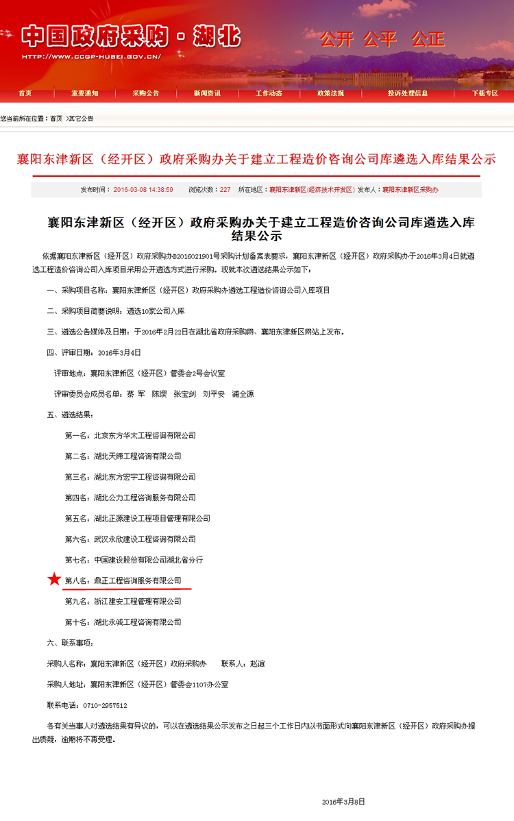 【經(jīng)營成果】我司入圍襄陽東津新區(qū)(經(jīng)開區(qū))政府采購辦工程造價咨詢公司庫