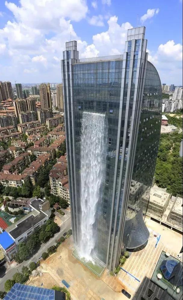遠(yuǎn)遠(yuǎn)望去,噴水的大廈像是懸掛一片白練,足足有100多米高,走進(jìn)一看,原來(lái)是真的瀑布
