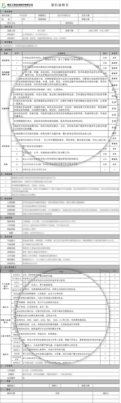 為優(yōu)化人才隊(duì)伍結(jié)構(gòu)及提高能力素質(zhì),鼎正人資部與造價(jià)咨詢事業(yè)部通過對(duì)項(xiàng)目經(jīng)理崗位職責(zé)進(jìn)行列舉和歸類,對(duì)工作流程、部門內(nèi)各職位間的職責(zé)分配進(jìn)行分析和規(guī)劃,共同編寫了造價(jià)咨詢事業(yè)部項(xiàng)目經(jīng)理崗位說明書,以便項(xiàng)目經(jīng)理和準(zhǔn)項(xiàng)目經(jīng)理們?nèi)轿涣私夤ぷ髂繕?biāo)以及在個(gè)人能力素質(zhì)方面的差距,從而制定合理的學(xué)習(xí)計(jì)劃。
